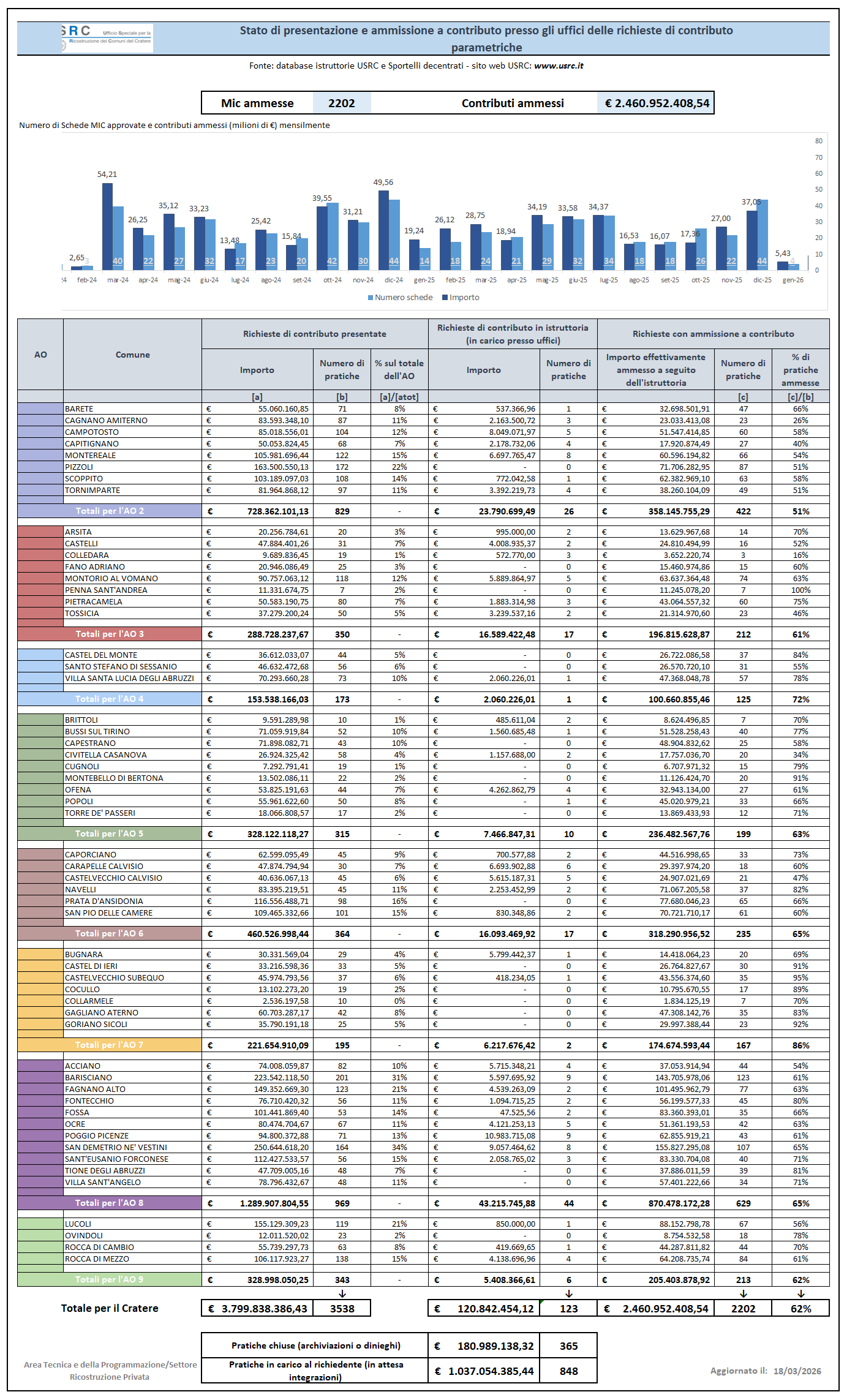Avanzamento delle pratiche di ricostruzione privata - "Schede MIC": 2202 approvazioni - 409 cantieri aperti e 961 chiusi